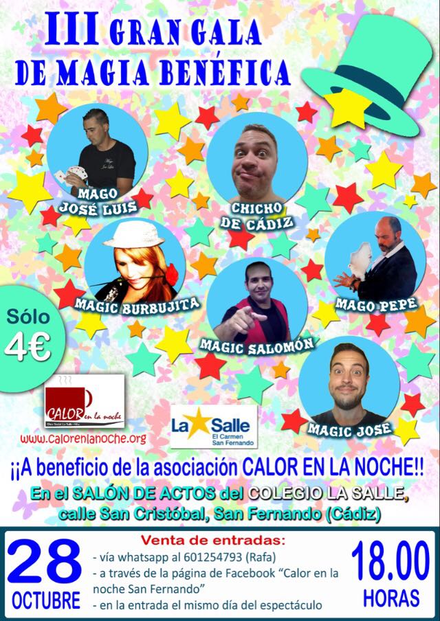 Por tercera ocasión presentamos la gala de magia benéfica a favor de nuestra asociación. Se celebrará el día 28 de Octubre en el colegio La Salle, en la calle San Cristobal. A partir de las 18 horas, y de la mano de Chicho de Cádiz, disfrutaremos de la magia del Mago Jose Luis, Magic Burbujita, Magic Salomón, Mago Pepe y Magic Jose.